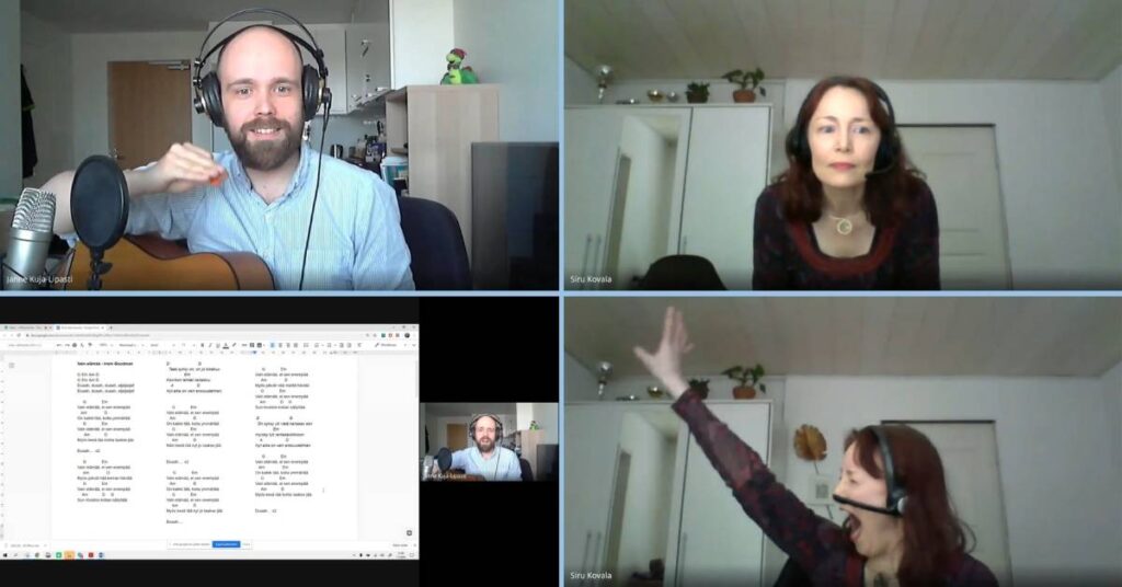Kuva: Janne Kuja-Lipastin vetämä laulutuokio. Sirun vetämä naamajumppa.
